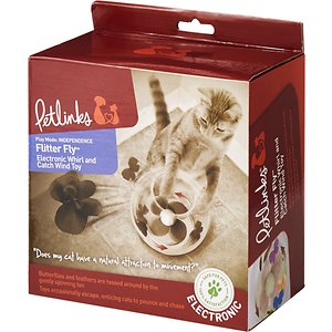 Petlinks Flitter Fly Cat Toy is a battery-powered toy that creates a mesmerizing flurry of butterflies, flowers and catnip. The clear bowl contains a fan at the bottom that blows the toys around and around in a whirlwind of motion. The Flitter Fly is great to relieve boredom! A supply of Pure Bliss organic catnip and three AA batteries are included.
