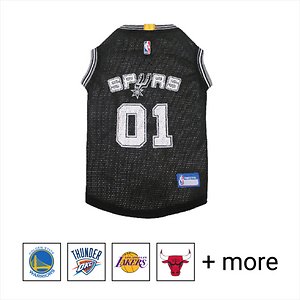 **Remember to measure your pet for the paw-fect fit.** Calling all basketball fans, get your four-legged mascot ready for game day with the Pets First NBA Mesh Dog & Cat Jersey. Sporting the official team name, logo, and colors of the team you choose, this high-quality jersey is made with breathable mesh so he never has to break a sweat during those close calls. The woven trim and screen printing looks just like what the pros wear, while the NBA “property of” jock tag on the back allows you to add a touch of personalization. Because win or lose, it’s all about the look for your favorite MVP—most valuable pet, that is!