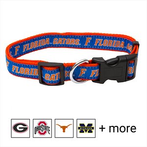 Let your pets show off their team spirit with the Pets First NCAA Dog Collar. This stylish dog collar features your favorite college football team’s name and logo sewn on to the collar. The nylon web collar is adjustable and proudly displays your team’s colors. It has a snap-lock plastic buckle that makes it easy to put on and take off as well as a silver D-ring to attach a lead.