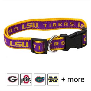 Let your pets show off their team spirit with the Pets First NCAA Dog Collar. This stylish dog collar features your favorite college football team’s name and logo sewn on to the collar. The nylon web collar is adjustable and proudly displays your team’s colors. It has a snap-lock plastic buckle that makes it easy to put on and take off as well as a silver D-ring to attach a lead.